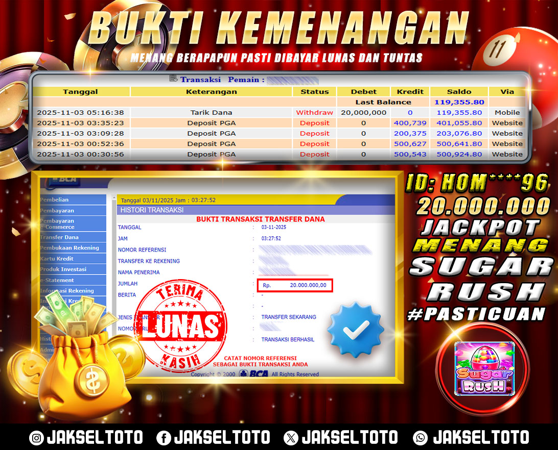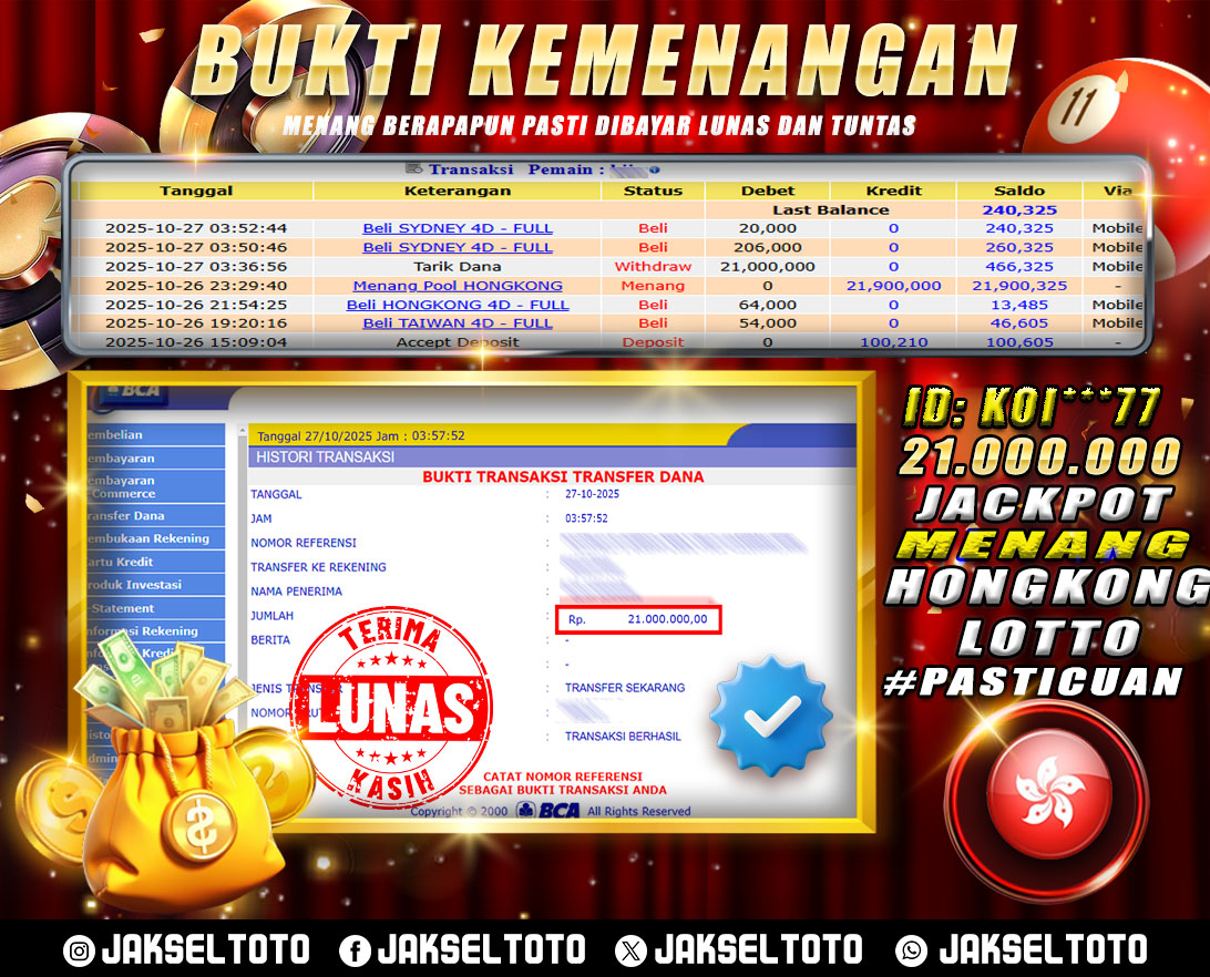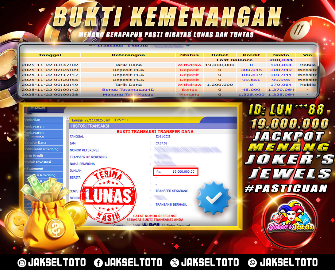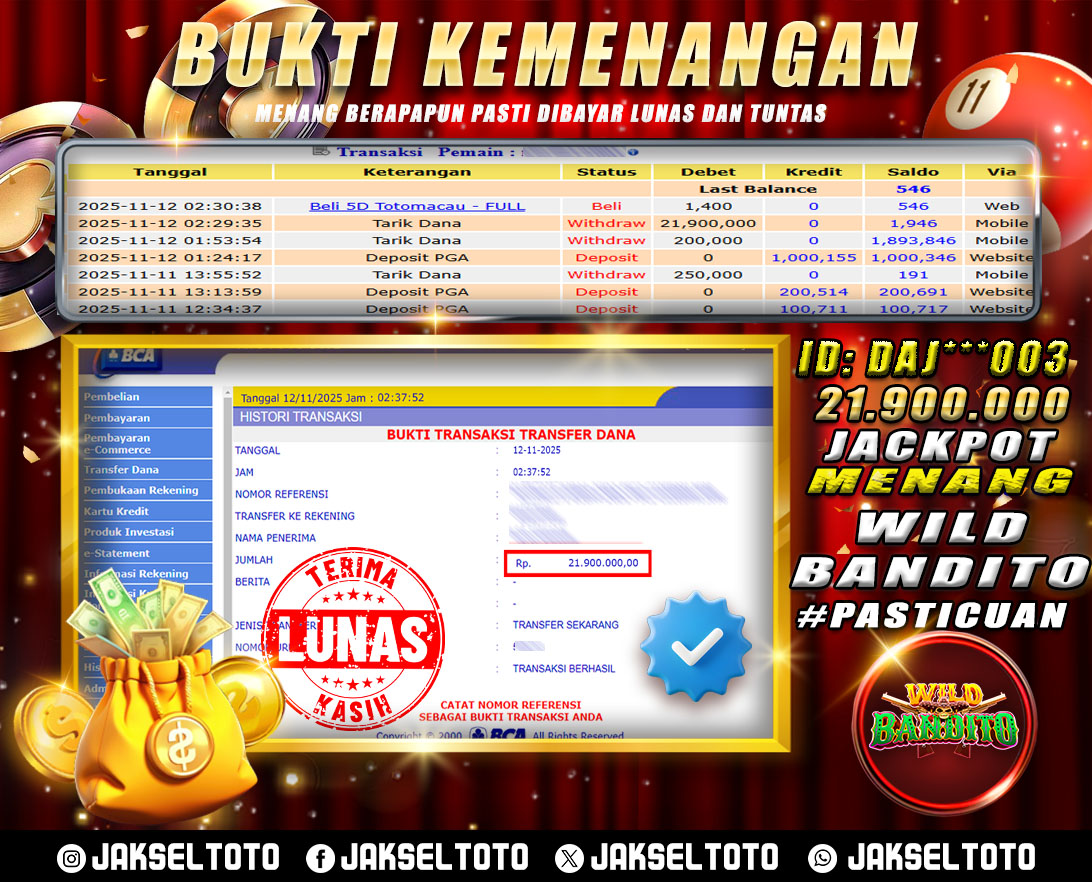 Bermain di BO JAKSELTOTO untuk kemenangan berapapun PASTI BAYAR!!! tidak perlu di ragukan lagi bermain di BO TERPERCAYA dan AMANAH, bukti JP TOGEL, LIVE GAME, SLOT terbesar dan real tidak ada potongan sedikitpun untuk kemenangan member, Situs BO terbesar di Indonesia dengan rate profit kemenangan yang fantastis!!!!!
