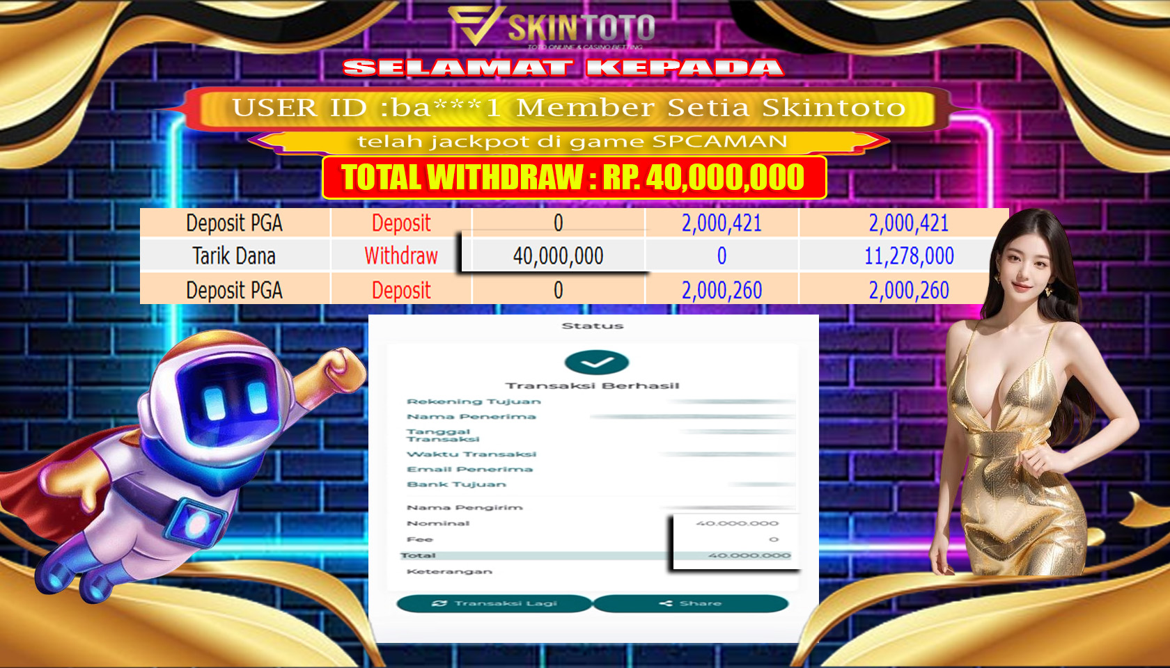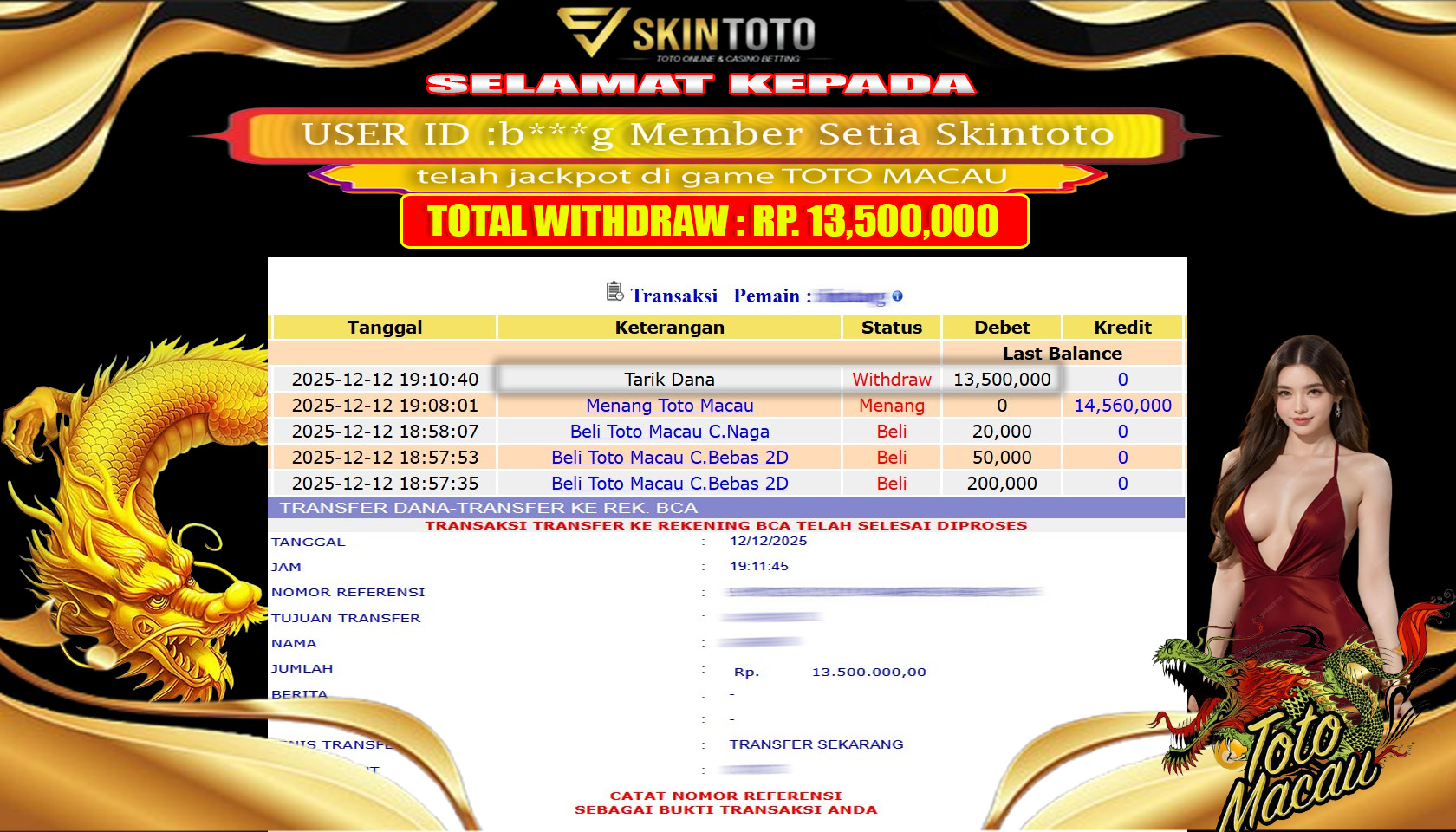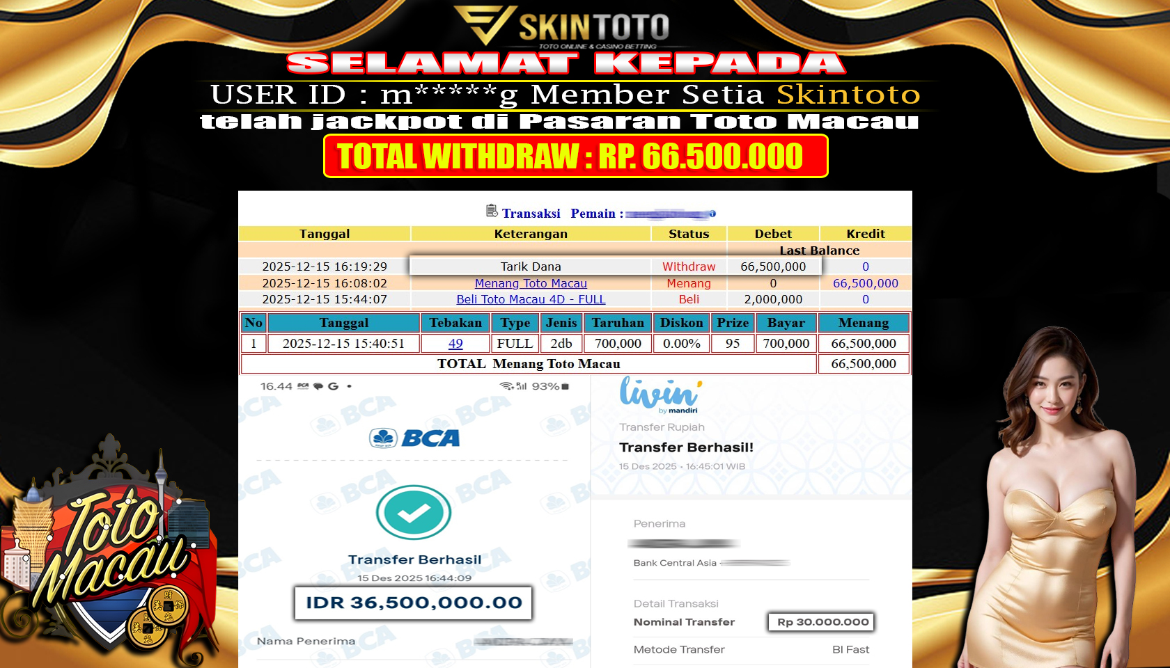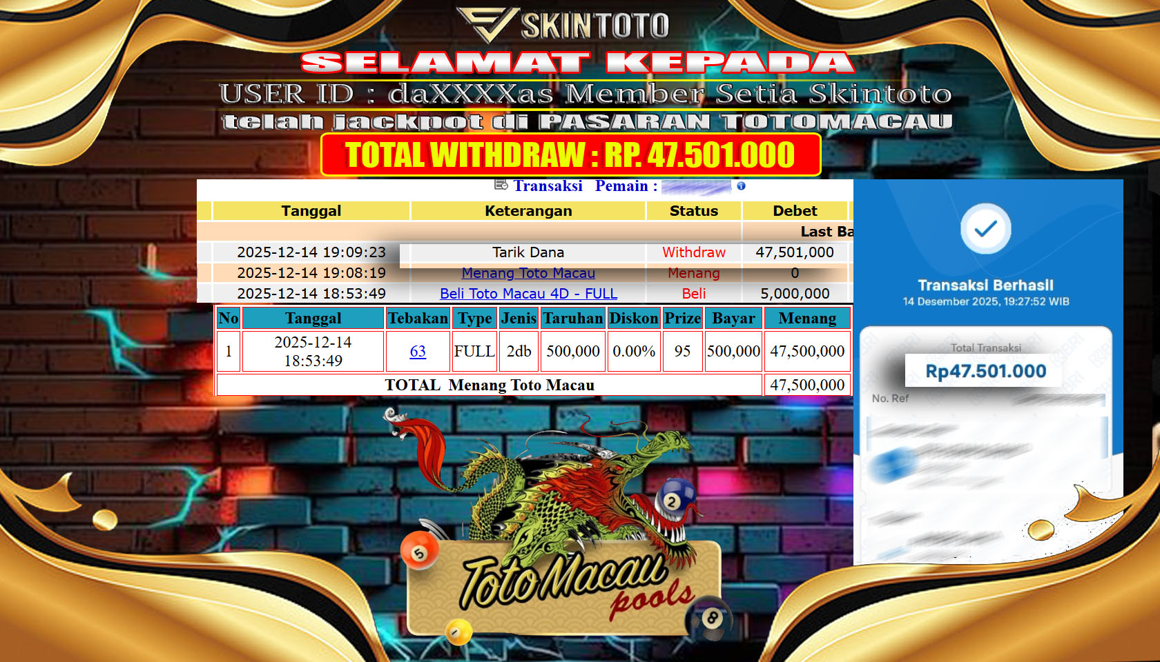 Bukti JP / Bukti Kemenangan Jackpot di permainan judi togel, judi casino ataupun judi slot online yang ada di situs SKINTOTO. Website nomormacau.com ini memberikan informasi terupdate dan terlengkap seputar dunia perjudian atau pertogelan. Maka dari itu situs resmi nomormacau ini memberikan informasi untuk bukti jackpot atau bukti kemenangan member yang ada di situs SKINTOTO ini telah di bayar lunas tanpa ada potongan sedikitpun. SKINTOTO agen slot online nomor 1, situs judi casino resmi dan bandar togel online paling terpercaya dan paling banyak di minati banyak orang.